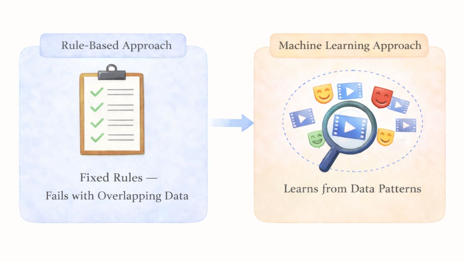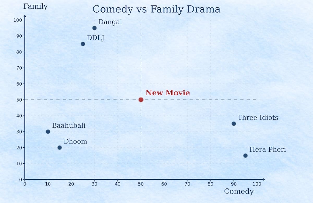 In the earlier example, RRR was closer to Dhoom and Baahubali. Its values were similar, so fixed rules worked there. But real situations are not always so clear. What happens when a new movie does not fall neatly into any predefined range?