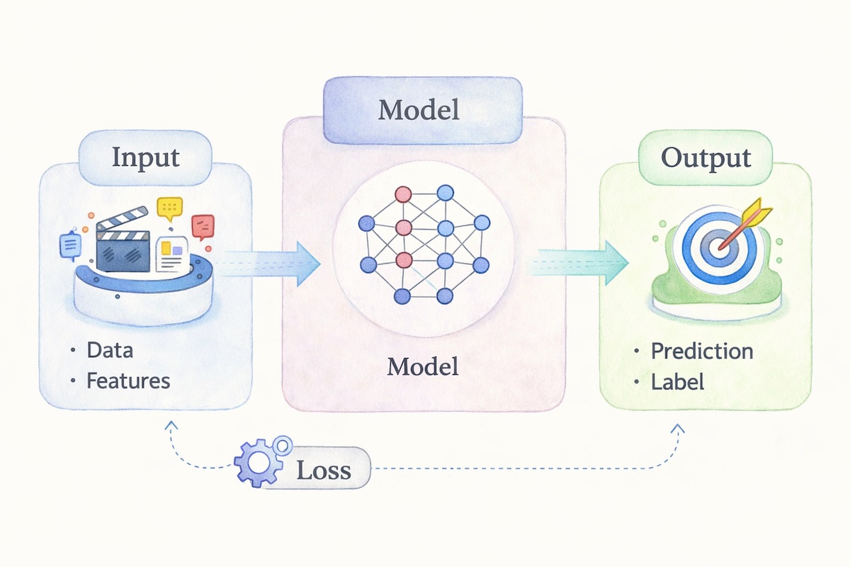 Every machine learning system follows a simple flow: Input → Model → Output → Learning through feedback.