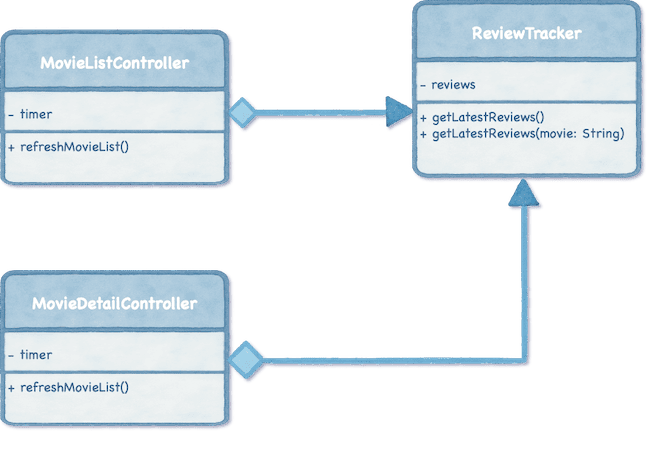 Then, the application already had a centralised ReviewTracker for managing review updates. Now, Spidey improves it by integrating the Observer pattern. Instead of requiring screens to check for updates, ReviewTracker now notifies them when new reviews are available, just like listening for a doorbell instead of constantly checking the door.