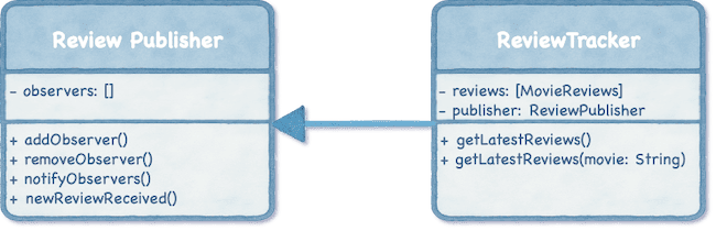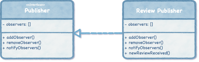 defines a Publisher interface to maintain a list of all observers who are interested in updates. Then, a concrete class called ReviewPublisher implements this interface, handling the logic of adding, removing, and notifying observers whenever a new review is available. Publisher remains simple: just managing a list of listeners and notifying them on changes.