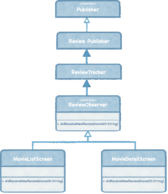 Further, when the MovieListScreen or MovieDetailScreen appears on the screen, it registers itself as an observer to the ReviewPublisher through the ReviewTracker. This means it’s letting the publisher know, “I’m interested. Please inform me when something new happens.”