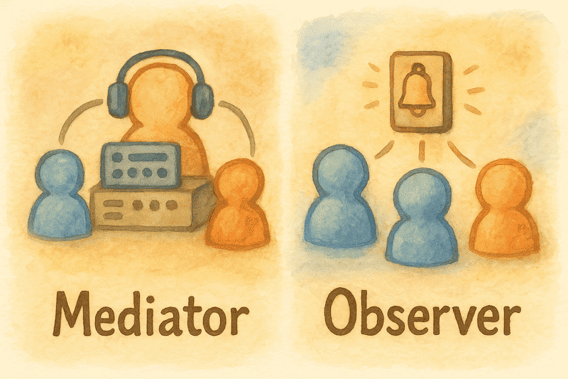 Both patterns help reduce tight coupling between components, but they do so in different ways. Mediator acts as a central object that manages interactions between different components. Objects don’t talk to each other directly; they communicate through a mediator, who routes requests and keeps components decoupled.