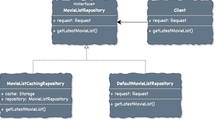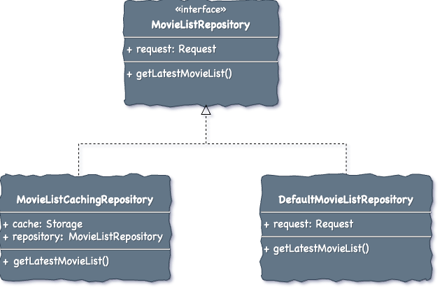 Architect Spidey created a decorator class MovieListCachingRepository that wraps the repository DefaultMovieListRepository. It implements the same MovieListRepository interface. This decorator calls the actual repository while also checking and caching data.