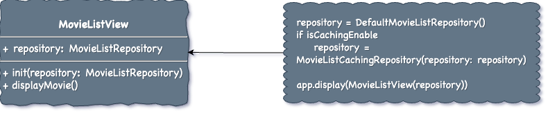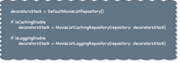 As Spidey in the application, based on the need, wraps the basic repository object into a MovieListCachingRepository. Similarly, you can create a stack of decorators to achieve the desired behaviour.