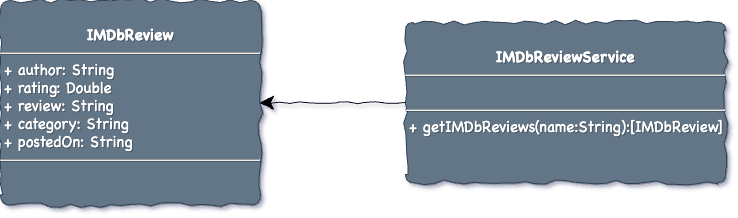 To fetch data from IMDb, she has a new service called IMDbReviewService, which returns a collection of IMDBReview objects matching the format received from the IMDb API