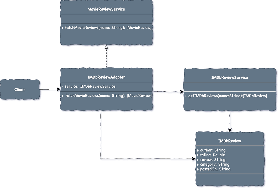 In our example, IMDbReviewAdapter plays the role of the adapter. It wraps around an IMDbReviewService object (which has a different structure) and translates it into the MovieReview format that the app understands â just like a translator plug for mismatched devices.