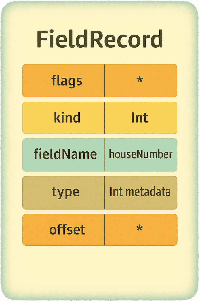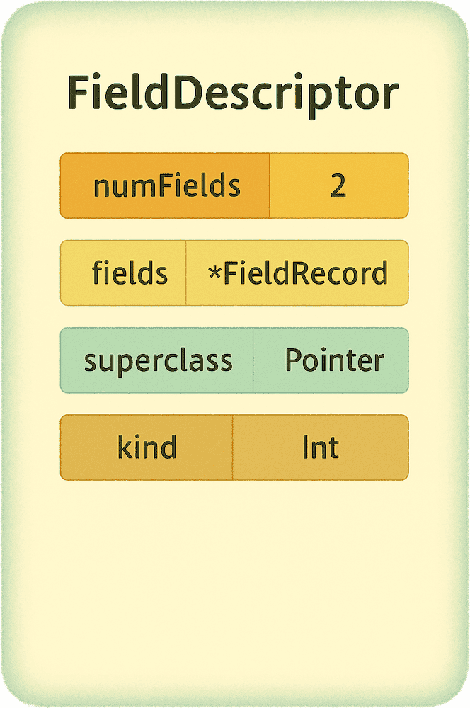 A reference to another piece of metadata, the FieldDescriptor, which holds detailed information about each stored property—its name, type, and field-level flags. This is where the runtime learns the fine details of every property within the type. The FieldDescriptor itself further contains individual FieldRecords, each representing a single stored property.