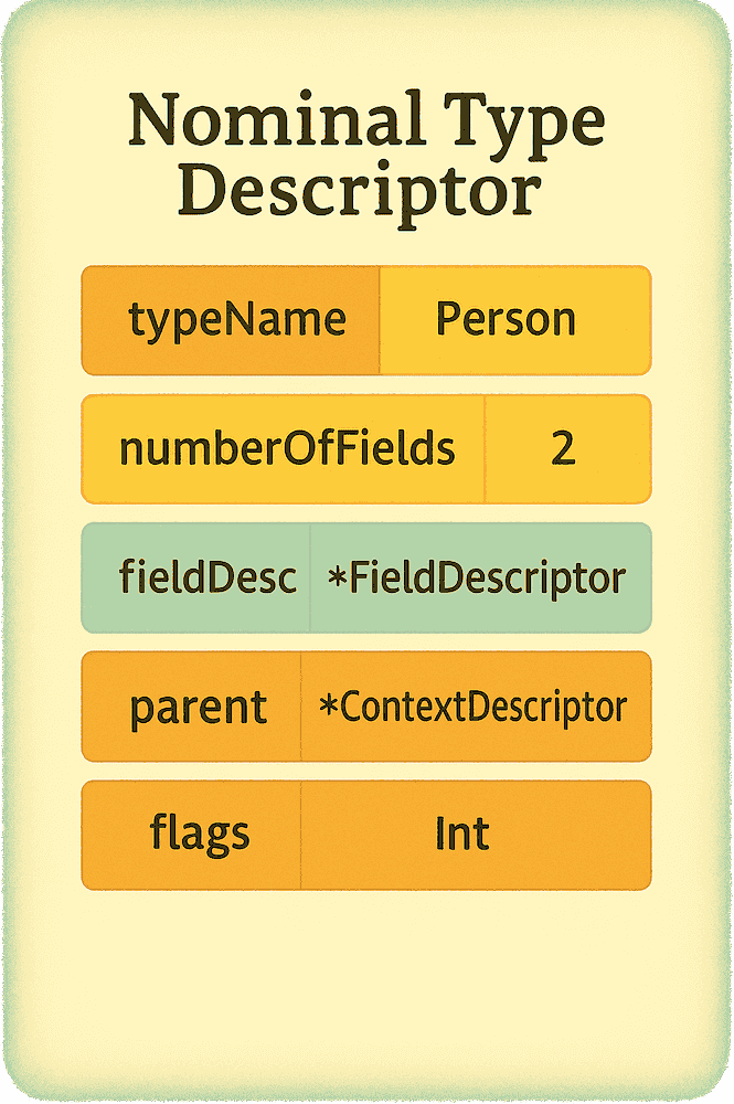 Conceptually, the following structure represents how Swift’s compiler records essential information about a type — its name, stored properties, and the context in which it’s defined: