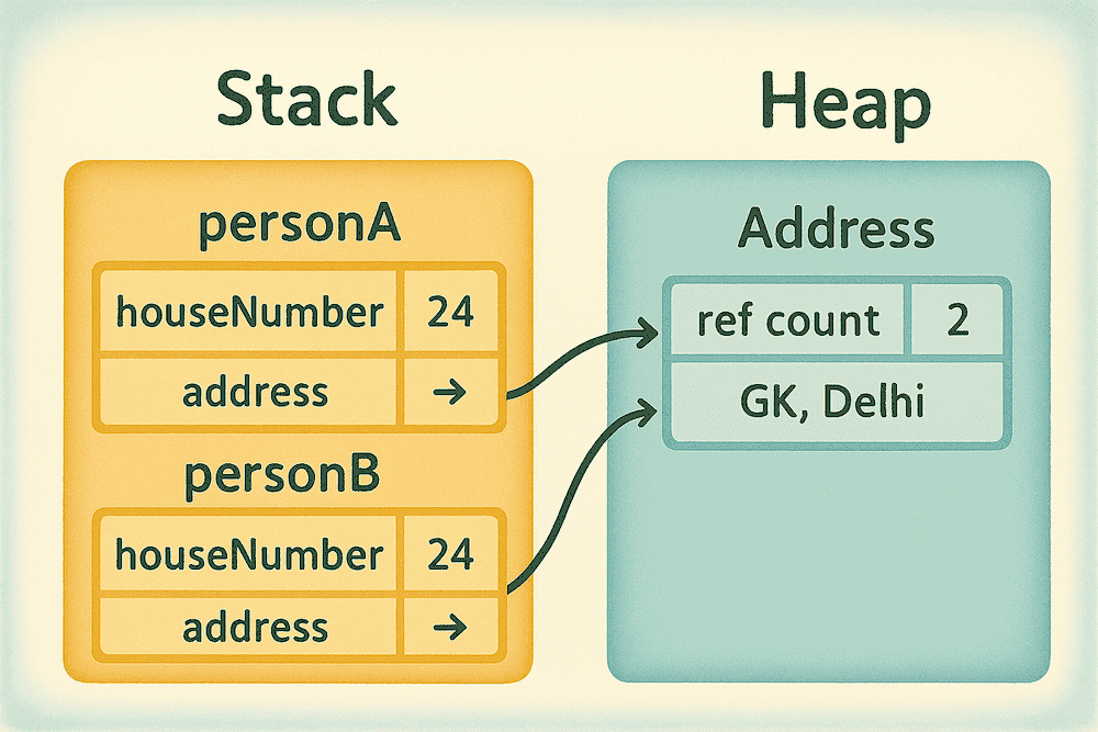 Here, the Address instance lives on the heap, and both personA and personB hold references to the same memory location.