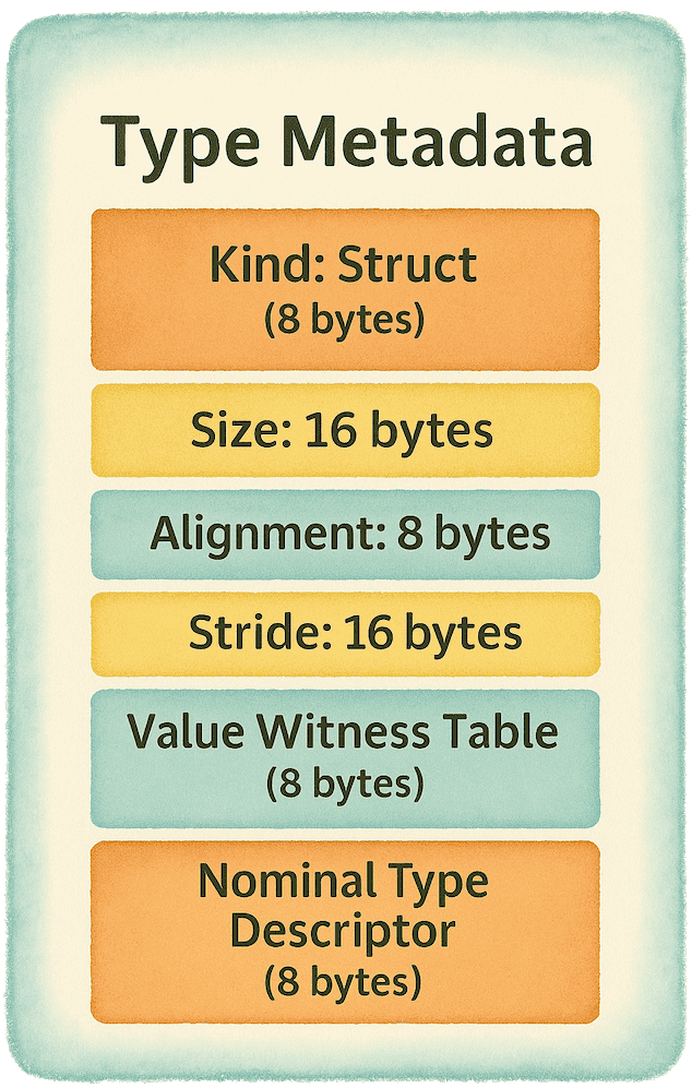 This isn’t the precise layout Swift uses internally, but it’s a helpful mental model to understand how Swift stores all the essential information about a type — its size, alignment, stride, and how instances are managed at runtime.