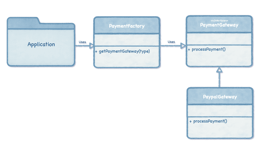 With this clear and inevitable need in mind, he decided to design an abstraction from the beginning: a PaymentGateway interface with a concrete PayPalGateway implementation, and a PaymentGatewayFactory to provide the appropriate gateway at runtime. This setup allowed new gateways to be added later without rewriting any business logic — just by implementing the interface and registering them with the factory.
